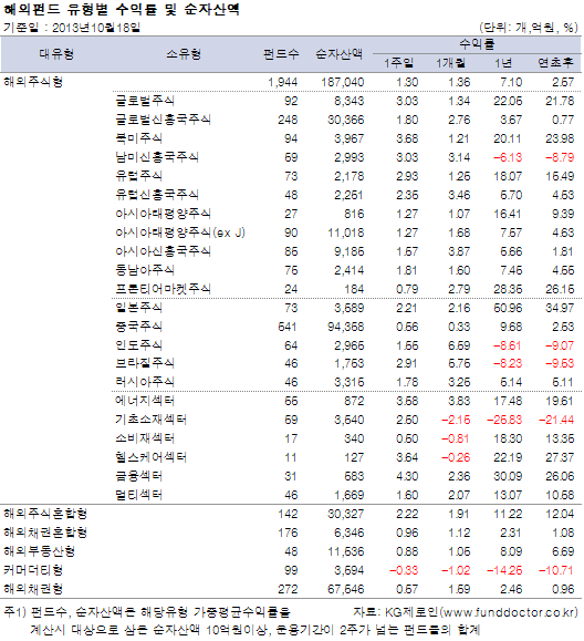 펀드평가사 KG제로인(www.FundDoctor.co.kr)이 18일 오전 공시된 기준가격으로 펀드수익률을 조사한 결과, 해외주식펀드는 한 주간 1.30% 상승했다. 해외주식형의 모든 소유형이 플러스 수익률을 기록하며 강세를 보였다.