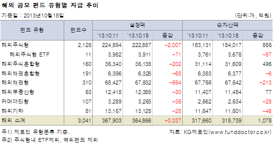 KG제로인 분류 기준으로 공모 해외펀드(역외펀드 제외) 설정액은 18일 현재 36조 4,866억원으로, 전주 대비 3,037억원 줄었다. 반면 순자산액도 1,078억원 증가한 31조 8,739억원으로 집계됐다.