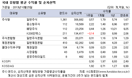 펀드평가사 KG제로인(WWW.Funddoctor.co.kr)이 10월 25일 오전 공시된 기준가격으로 펀드수익률을 조사한 결과, 국내주식형 전체로는 한 주간 0.32% 상승했다. 중소형주가 강세를 보인 가운데, 중소형주식펀드는 2.22%의 수익률로 주식형 중 가장 우수했다. 일반주식펀드와 배당주식펀드도 각각 0.57%, 0.44% 상승했다. 반면 한 주간 대형주가 약보합세를 보이면서 K200인덱스펀드의 수익률은 -0.14%로 소폭 하락하는 모습을 보였다. 업종별로는 지난 주와는 반대로 음식료품, 의료정밀, 운수창고, 통신업 등의 업종이 높은 펀드들이 강세를 나타났고, 반면에 운수장비, 기계, 전기전자 등 관련 펀드들은 약세를 보였다.