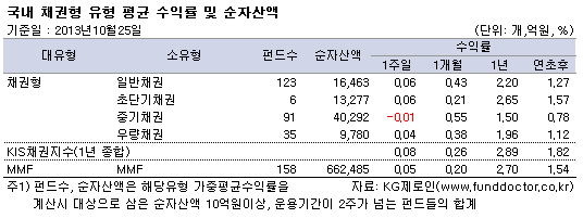 중기채권펀드가 0.33%의 수익률로 채권형 펀드 중 가장 양호한 성과를 냈다. 우량채권펀드와 일반채권펀드는 각각 0.18%, 0.17%의 수익률을 기록했다. 한편 단기적으로 운용하는 초단기채권펀드와 MMF는 각각 0.05%씩 상승하는데 그쳤다.