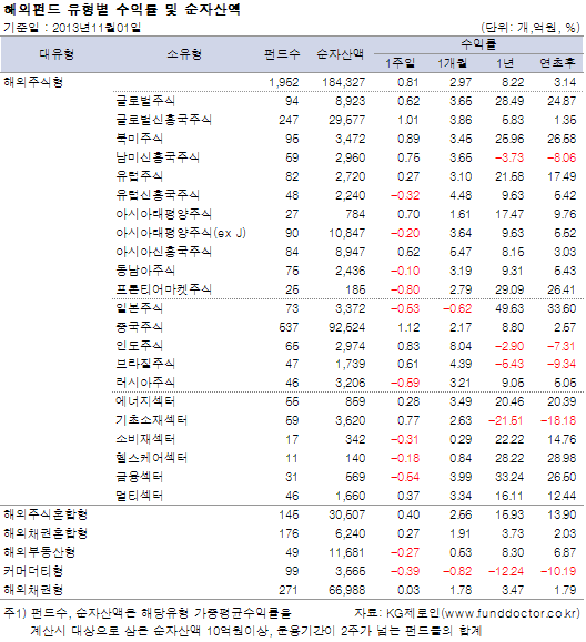펀드평가사 KG제로인(www.FundDoctor.co.kr)이 1일 오전 공시된 기준가격으로 펀드수익률을 조사한 결과, 해외주식펀드는 한 주간 0.81% 상승했다. 글로벌주식펀드도 0.62%의 수익률로 소폭 상승했다.