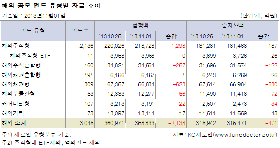 KG제로인 분류 기준으로 공모 해외펀드(역외펀드 제외) 설정액은 1일 현재 35조 8,833억원으로, 전주 대비 2,138억원 줄었다. 또한 순자산액도 471억원 감소한 31조 5,471억원으로 집계됐다.