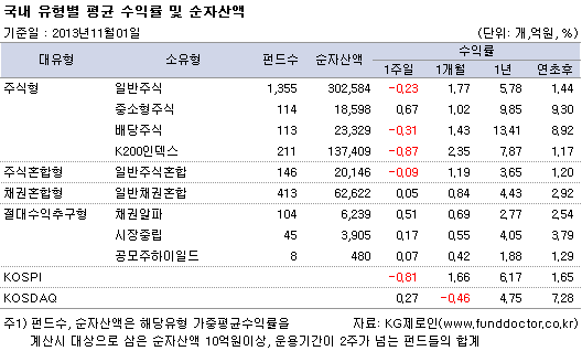 펀드평가사 KG제로인(www.FundDoctor.co.kr)이 11월 1일 오전 공시된 기준가격으로 펀드수익률을 조사한 결과, 국내주식형 전체로는 한 주간 0.56% 하락했다. 대부분의 국내주식펀드가 마이너스 성과를 보인 가운데, 중소형주식펀드가 0.67% 상승해 주식형 중 가장 양호한 성과를 거두었다. 한편 일반주식펀드와 배당주식펀드는 각각 0.23%, 0.31% 하락했다. 또한 한 주간 대형주가 약세를 보이면서 K200인덱스펀드가 지난주에 이어 0.87% 하락했다. 업종별로 살펴보면 비금속광물제품, 의약품, 음식료품 등의 업종이 강세를 나타냈으며, 운수창고업, 의료정밀, 통신업 등이 하락하면서 관련 업종 비중이 높은 펀드들은 약세를 보였다.