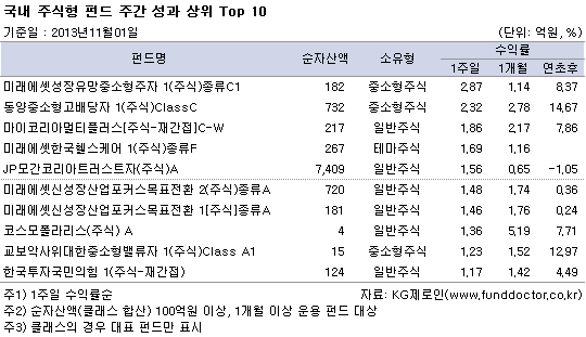 중소형주 강세에 힘입어 중소형주식펀드인 ‘미래에셋성장유망중소형주자 1(주식)종류C1’와 ‘동양중소형고배당자 1(주식)ClassC’ 펀드가 각각 2.87%, 2.32% 상승하며 나란히 주간 성과 1위, 2위를 차지했다.
