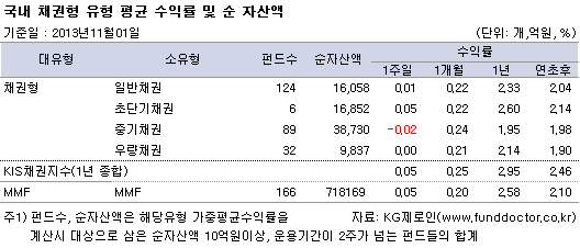 단기적으로 운용하는 초단기채권펀드와 MMF가 모두 0.05%의 수익률로 채권형 펀드 중 가장 양호한 성과를 거두었다. 일반채권펀드가 0.01% 상승하여 그 뒤를 이었으며, 우량채권펀드는 0.00%의 수익률을 보였다. 반면, 보유채권의 평균 듀레이션이 긴 중기채권펀드 0.02% 소폭 하락했다.
