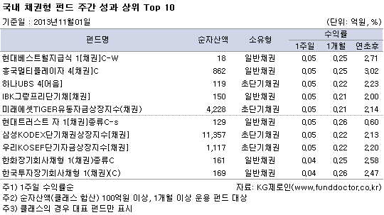 지난주와 대비되는 양상으로 타겟 듀레이션이 짧은 초단기채권펀드들이 주간 성과 상위권에 대거 올랐다. ‘하나UBS 4[어음]’, ‘미래에셋TIGER유동자금상장지수(채권)’ 등이 한 주간 0.05% 상승하며 선전했다. 일반채권펀드인 ‘현대베스트월지급식 1[채권]C-W’, ‘흥국멀티플레이자 4[채권]C’ 등도 0.05%의 성과를 거두며 양호한 모습을 보였다.