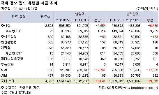 11월 1일 현재, 제로인 유형분류 기준으로 펀드자금 동향을 조사한 결과, 국내 공모펀드 설정액은 한 주간 1조 9,041억원 감소한 154조 2,208억원, 순자산액은 1조 9,012억원 감소한 159조 7억원으로 집계됐다.