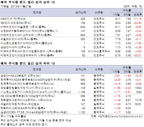펀드평가사 KG제로인(www.FundDoctor.co.kr)이 11월 1일 공시된 기준가격으로 펀드 수익률을 집계한 결과, 해외주식펀드는 한 달간 2.97% 상승했다. 인도주식펀드의 상승폭이 눈에 띄는 가운데 일본주식펀드를 제외한 모든 유형의 해외주식펀드가 플러스 성과를 기록했다.