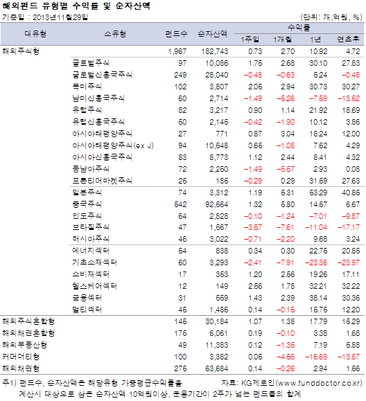 펀드평가사 KG제로인(www.FundDoctor.co.kr)이 29일 오전 공시된 기준가격으로 펀드수익률을 조사한 결과, 해외주식펀드는 한 주간 0.73% 상승했다. 전주대비 상승폭은 줄었지만 플러스수익률을 기록하며 강세를 이어갔다.