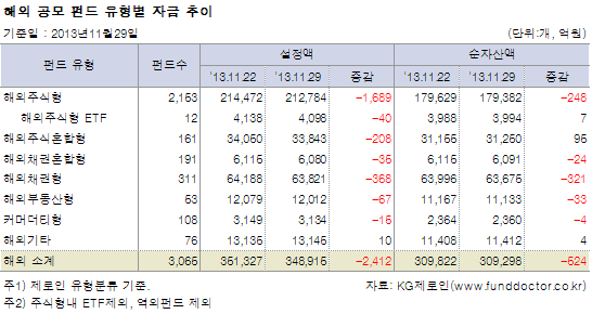 KG제로인 분류 기준으로 공모 해외펀드(역외펀드 제외) 설정액은 29일 현재 34조 8,915억원으로, 전주 대비 2,412억원 줄었다. 또한 순자산액도 524억원 감소한 30조 9,298억원으로 집계됐다.