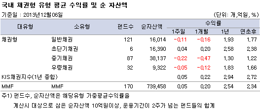 소유형 가운데 중기채권펀드는 0.22% 하락하며 가장 부진한 한 주를 기록했다. 우량채권펀드와 일반채권펀드는 각각 -0.05%, -0.11%의 수익률을 나타냈으며, 단기적으로 운용하는 초단기채권펀드와 MMF가 각각 0.04%, 0.05%의 플러스 수익률로 채권형 펀드 중 양호한 성과를 냈다.