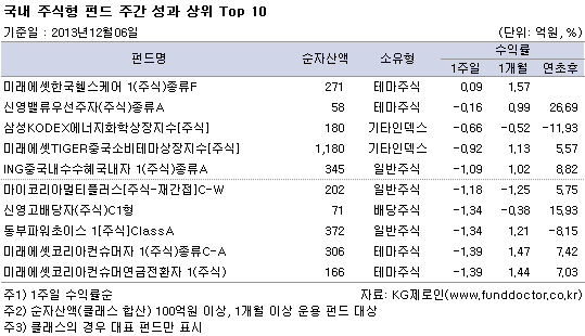 펀드평가사 KG제로인(www.Funddoctor.co.kr)이 12월 6일 오전 공시된 기준가격으로 펀드 수익률을 조사한 결과, 국내주식형 전체로는 한 주간 3.00% 하락했다. 중소형주에 비해 대형주가 약세를 보이자 시가총액 상위 종목에 주로 투자하는 K200인덱스펀드가 -3.20%의 수익률로 주식형펀드 중 가장 부진했다. 일반주식펀드와 중소형주식펀드도 각각 2.72%, 1.99% 하락했다. 배당주식펀드의 수익률 또한 -1.95%를 보이며 주식형펀드 전 유형에서 마이너스 성과를 기록했다.