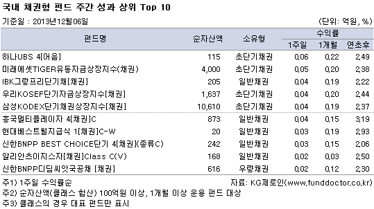초단기채권펀드와 일반채권펀드가 상위권을 휩쓸었다. ‘하나UBS 4[어음]’ 펀드가 0.06%의 수익률로 주간 성과 1위를 기록했다. 그 외에 ‘미래에셋TIGER유동자금상장지수(채권)’, ‘우리KOSEF단기자금상장지수[채권]’ ETF펀드도 각각 0.05%, 0.04%의 양호한 수익률로 상위권에 자리했다.
