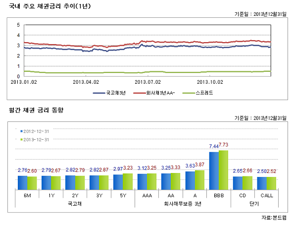 2013년 채권시장은 1분기 미국채 금리하락, 기준금리 인하 기대 강화 등의 영향으로 갈수록 금리 하단이 낮춰지는 흐름이 계속됨에 따라 강세를 나타냈다. 한 때 기준금리는 국고채 5년물 기준 역사적 최저점에 도달하기도 했다.