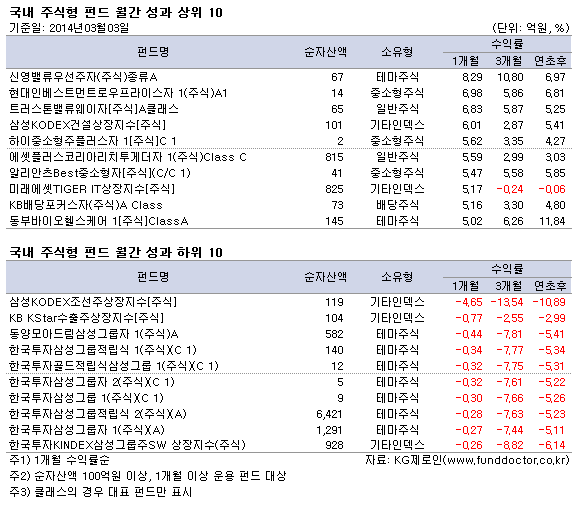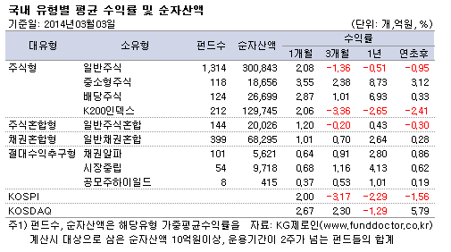 펀드평가사 KG제로인(www.FundDoctor.co.kr)이 3월 3일 공시 기준가격으로 2014년 2월 펀드수익률을 조사한 결과 국내주식형 펀드는 2.03% 상승했다. 코스피지수가 상승세를 보임에 따라 소유형 기준 모든 펀드들이 플러스 성과를 기록했다.