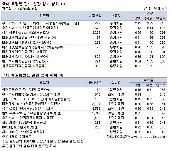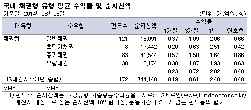 펀드평가사 KG제로인(www.FundDoctor.co.kr)이 3월 3일 공시 기준가격으로 2014년 2월 펀드수익률을 조사한 결과 국내채권형 펀드의 평균 수익률은 0.43%로 나타났다.