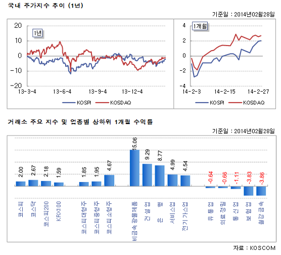 2월 코스피지수는 전월 대비 2.0% 상승했다. 옐런 美 연준 의장의 초저금리 기조 유지발언과 유럽 경제에 대한 낙관적 전망을 바탕으로 외국인이 순매수로 전환했고, 박근혜 정부의 경제개혁 3개년 계획발표에 따른 정책 기대감이 국내 주식시장에 긍정적으로 작용했다.