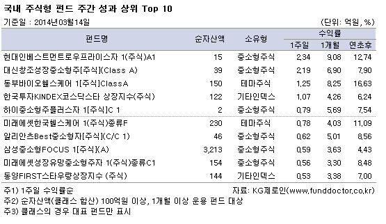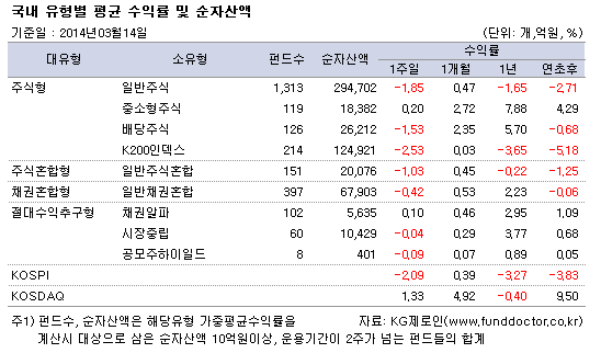 펀드평가사 KG제로인(www.Funddoctor.co.kr)이 3월 14일 오전 공시된 기준가격으로 펀드 수익률을 조사한 결과, 국내주식형 전체로는 한 주간 2.21% 하락했다. 대형주에 비해 중소형주가 강세를 보이자 전반적인 하락세 속에서 중소형주식펀드가 0.20%의 수익률로 주식형펀드 중 가장 우수했다. 일반주식펀드와 배당주식펀드는 각각 1.85%, 1.53% 하락했다. 시가총액 상위 종목에 주로 투자하는 K200인덱스펀드는 -2.53%의 수익률을 기록하며 소유형 기준 가장 부진했다.