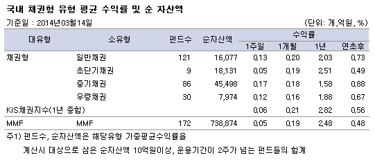 순자산액(클래스 합산) 100억원 이상, 운용기간 1개월 이상인 135개 국내채권형 펀드 가운데 135개 펀드 모두 플러스 성과를 기록했다. KIS채권지수(1년 종합) 수익률을 상회한 펀드는 126개인 것으로 나타났다.