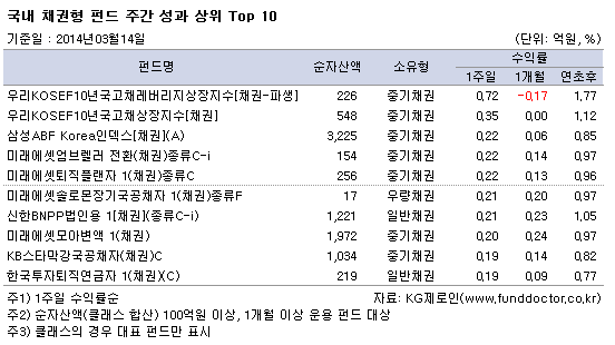 중기채권펀드가 상위권을 휩쓸었다. ‘우리KOSEF10년국고채레버리지상장지수[채권-파생]’ 펀드가 0.72%의 수익률로 주간 성과 1위를 기록했다. 그 외에 ‘우리KOSEF10년국고채상장지수[채권]’, ‘삼성ABF Korea인덱스[채권](A)’ 펀드도 각각 0.35%, 0.22%의 양호한 수익률로 상위권에 자리했다.