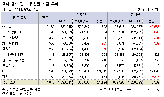 14일 현재, 제로인 유형분류 기준으로 펀드자금 동향을 조사한 결과, 국내 공모펀드 설정액은 한 주간 2조 1,194억원 증가한 162조 35억원, 순자산액은 6,302억원 증가한 162조 8,899억원으로 집계됐다.