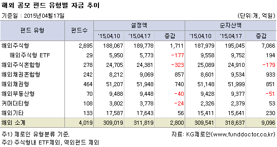 KG제로인 분류 기준으로 공모 해외펀드(역외펀드 제외) 설정액은 17일 현재 31조 1819억원으로, 전주 대비 2800억원 증가했다. 순자산액 또한 9096억원 증가한 31조 8637억원으로 집계됐다.