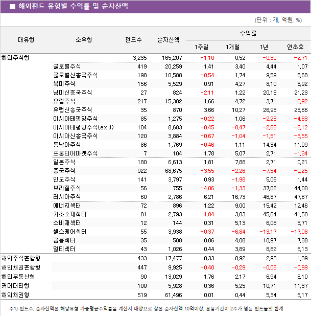 제로인 유형분류 기준 공모 해외펀드(역외펀드 제외) 순자산액은 2572억원 감소한 29조 180억원으로 집계됐다. 설정액은 32조 3168억원으로 전주 대비 1195억원 감소했다.
