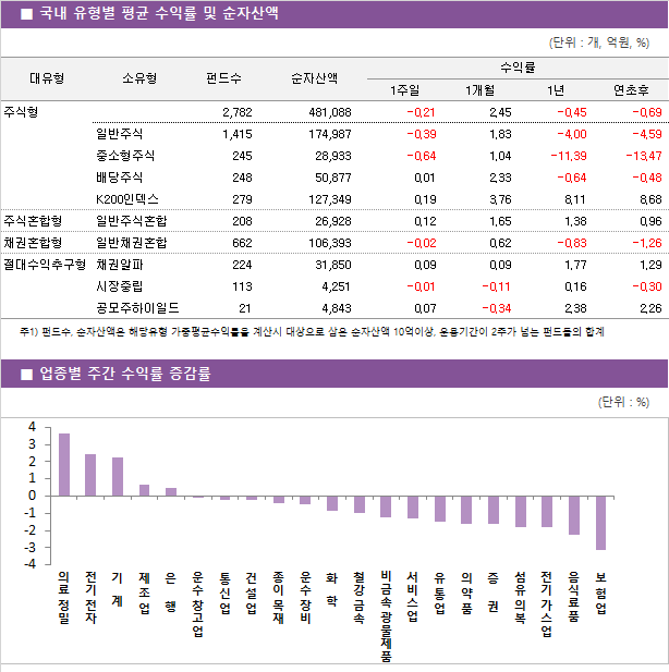 펀드평가사 KG제로인(www.Funddoctor.co.kr )의 12월 23일 오전 공시된 기준가격으로 펀드 수익률을 조사한 결과, 전체 국내주식형펀드는 한 주간 0.21% 하락했다. 국내증시가 규모별로 엇갈린 수익률을 기록한 가운데 펀드유형별 수익률 또한 혼조세로 마감했다.