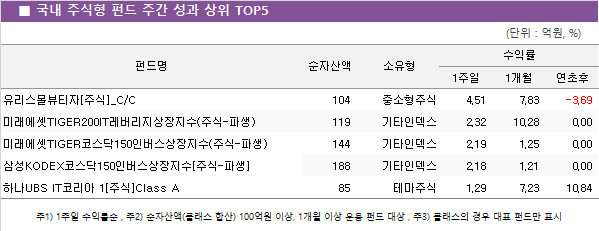순자산액(클래스 합산) 100억원 이상, 운용기간 1개월 이상인 국내주식형펀드 1,729개 중 853개가 플러스 수익률을 기록했다. 코스피지수 수익률을 상회한 펀드는 927개로 나타났다. 한 주간 약보합세 증시가 연출된 가운데, 시장과 반대로 투자하는 인버스펀드, 대형주 종목 혹은 IT관련 종목에 투자하는 펀드가 상대적으로 우수한 성과를 보였다. 개별펀드 주간 성과는 ‘유리스몰뷰티자[주식]_C/C'펀드가 4.51%의 수익률로 국내 주식형 펀드가운데 최고성과를 기록했다.