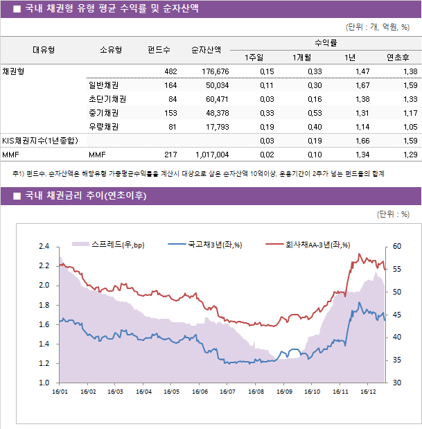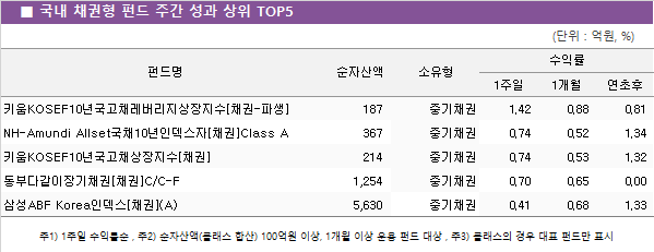 세부 유형별로 살펴보면, 타겟 듀레이션을 2~4년으로 운용하는 중기채권형펀드가 0.33%의 수익률을 기록했고, 이어 우량채권형펀드와 일반채권형펀드가 각각 0.19%, 0.11% 상승한 것으로 집계됐다. 모든 유형에서 플러스 수익률을 기록한 가운데, 금리상승 영향으로 만기가 길게 운용된 펀드들이 상대적으로 높은 수익률을 기록했다.