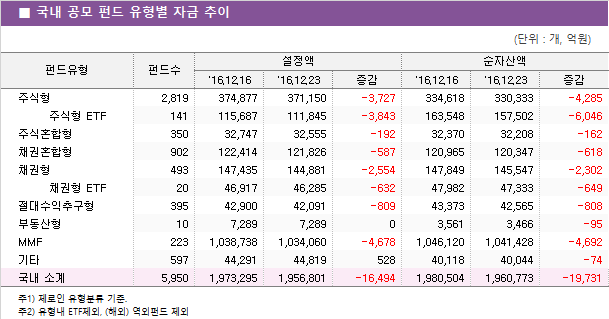 12월 23일 현재 제로인 유형별 펀드자금 동향을 조사한 결과, 국내 공모펀드 설정액은 한 주간 1조 6494억원 감소한 195조 6801억원으로 집계되었다. 순자산액은 1조 9731억원 감소한 196조 773억원으로 나타났다.