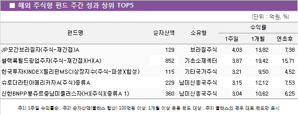 순자산액(클래스 합산) 100억원 이상, 운용기간 1개월 이상인 1715개 해외주식형 펀드 중 1342개 펀드가 플러스 수익률을 기록했다. 지역별로는 브라질, 남미신흥국 주식펀드가 우수한 성과를 보였고, 섹터별로는 기초소재섹터펀드가 양호한 모습을 보였다. 개별펀드 중 'JP모간브라질자(주식-재간접)A'펀드가 4.03%의 수익률로 해외주식형 펀드 중 가장 우수했다.
