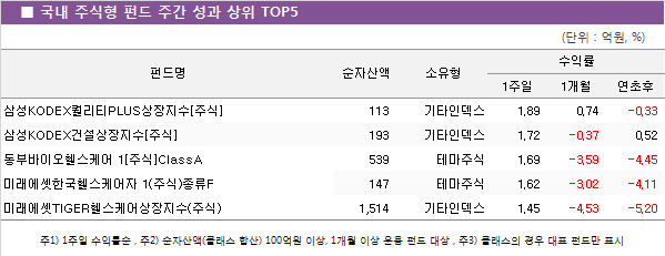 순자산액(클래스 합산) 100억원 이상, 운용기간 1개월 이상인 국내주식형펀드 1,726개 중 312개가 플러스 수익률을 기록했다. 코스피지수 수익률을 상회한 펀드는 836개로 나타났다. 음식료품과 의약품 등이 강세를 보이면서 관련 종목 편입 비중이 높은 펀드들이 상위권에 자리했다. 개별펀드 주간 성과는 ‘삼성KODEX퀄리티PLUS상장지수[주식]'펀드가 1.89%의 수익률로 국내 주식형 펀드 최고성과를 기록했다.