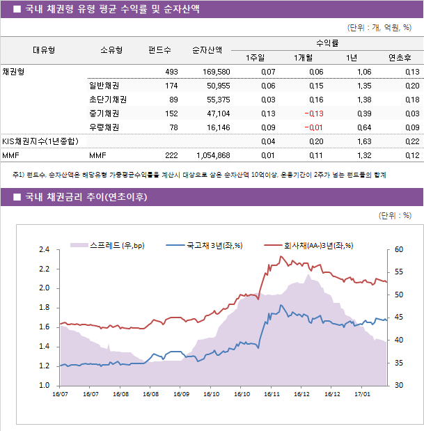 펀드평가사 KG제로인(www.Funddoctor.co.kr)의 2월 3일 오전 공시된 기준가격으로 펀드 수익률을 조사한 결과, 전체 국내채권형펀드는 한 주간 0.07% 상승했다. 채권펀드의 소유형 성과는 전반적으로 상승세였으며, 그 중 중기채권이 가장 높은 수익률을 기록했다