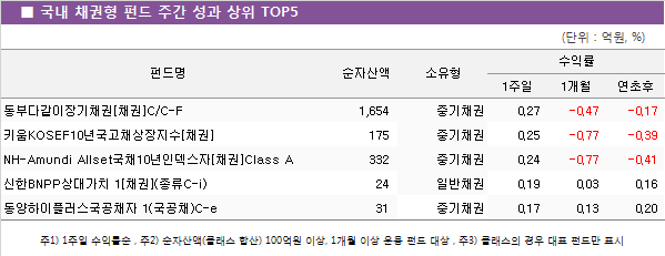 세부 유형별로 살펴보면, 중기채권형펀드와 우량채권형펀드가 각각 0.13%, 0.09% 수익률을 기록했다. 이어 일반채권형펀드와 초단기채권형펀드가 각각 0.06%, 0.03% 수익률을 기록했다.