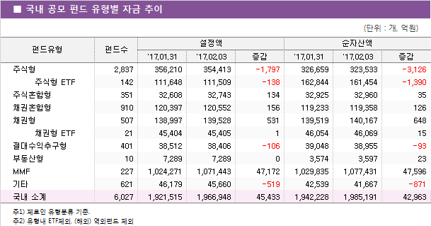 주식혼합형펀드의 설정액은 134억원 증가하였고, 채권혼합형펀드의 설정액 또한 156억원 증가했다. 그 외에 절대수익추구형의 설정액이 106억원 감소했고, 기타(ELF 포함) 유형펀드의 설정액도 519억원 감소한 것으로 확인됐다.