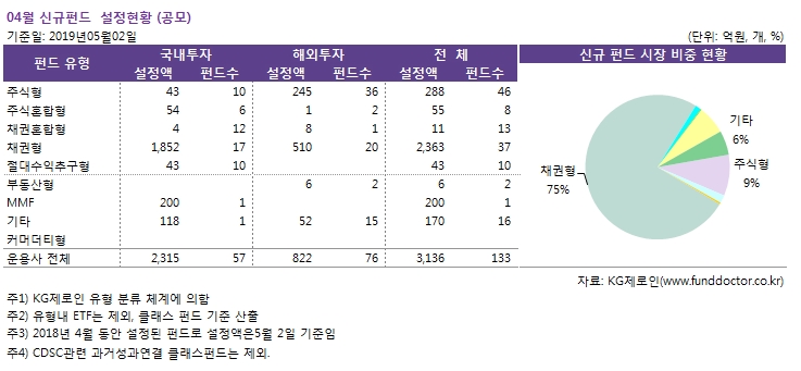 2019년 4월 동안 신규 설정된 공모펀드는 133개로, 신규 설정 펀드들의 5월 2일 기준 설정액은 3,136억원으로 집계됐다. 이 중 국내에 투자하는 펀드의 설정액은 2,315억원, 해외투자펀드는 822억원으로 나타났다.