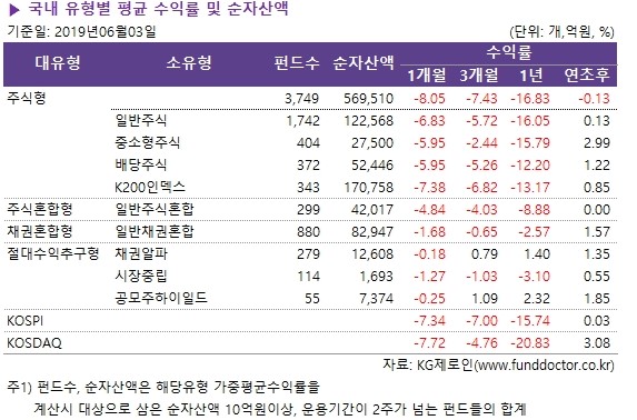 펀드평가사 KG제로인(www.FundDoctor.co.kr)이 2019년 6월 3일 공시된 기준가격으로 5월 펀드수익률을 조사한 결과 국내 주식형펀드는 8.05% 하락했다. 코스피 와 코스닥지수 모두 하락한 가운데 소유형 기준으로 모든 주식형 펀드들이 전월 대비 하락으로 마감했다.