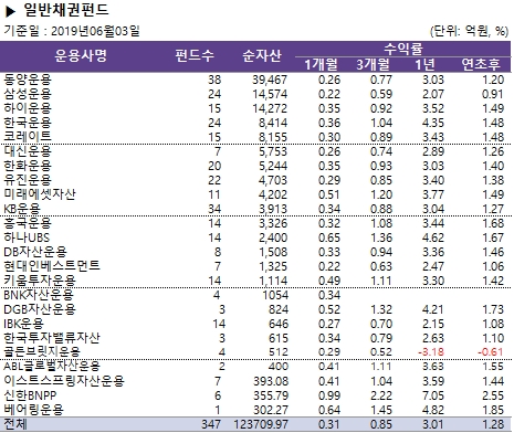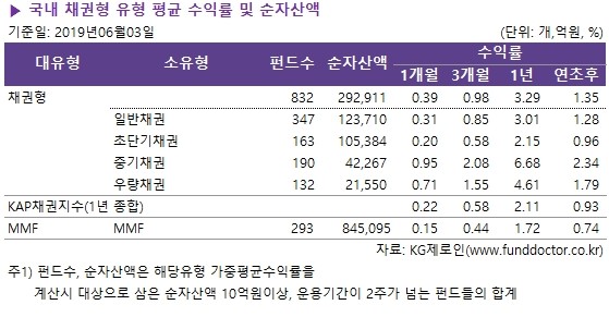 펀드평가사 KG제로인(www.FundDoctor.co.kr)이 2019년 6월 3일 공시된 기준가격으로 5월 펀드수익률을 조사한 결과 채권형 펀드의 1개월 수익률은 0.39%로 집계됐다.