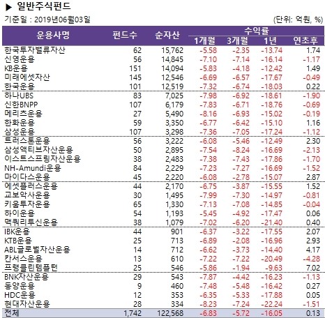 2019년 5월 한 달간 일반주식펀드 운용사별 성과를 살펴보면, 순자산액 300억원 이상인 29개 운용사가 모두 마이너스 수익률을 기록했다.