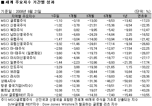 미국 양대 모기지업체인 패니매와 프레디맥의 국유화 가능성이 제기되면서 신용위기 불안이 여전한 가운데 국제유가까지 오르자 글로벌 투자심리가 급속도로 악화됐다. 여기에 계속된 글로벌 경기침체 우려가 고조되면서 대부분의 해외펀드는 약세를 보였다.