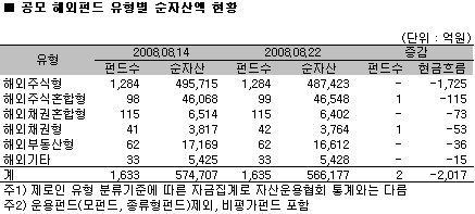 현금흐름을 살펴보면, 한주간 해외펀드는 총 2,017억원의 자금이 유출됐다. 유형별로는 연이은 해외주식형 펀드의 부진에 해외주식형에서만 1,725억원의 자금이 이탈했고, 해외주식혼합형과 해외채권혼합형에서도 각각 115억원, 73억원의 자금이 유출되는 등 전 유형에서 자금이 빠져나간 것으로 조사됐다.