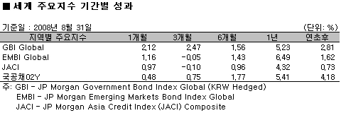 펀드평가사 제로인(www.funddoctor.co.kr)이 2008년 9월 1일 아침 공시된 기준가격으로 8월 한달간 해외펀드의 수익률을 조사한 결과, 해외주식형펀드는 -4.19%의 부진한 성과를 기록했다.
