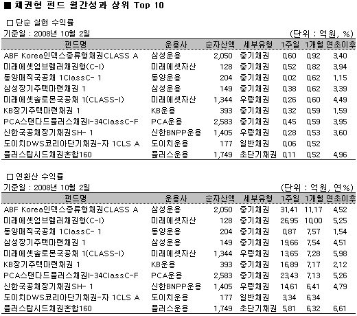 개별 펀드별로는 삼성운용의 ‘ABF Korea인덱스종류형채권CLASS A’펀드가 주간 0.60%(연환산 31.41%)로 주간순위 1위를 기록했다. 2005년 4월 설정돼 3년 넘게 운용중인 이 펀드는 해외 인덱스 제공자인 IIC가 산출 및 제공하는 iBoxx ABF Korea Index와 유사한 수익을 실현하는 것을 목표로 하고 있다. 주로 국공채와 통안채 등 신용등급이 높은 종목들로 포트폴리오를 구성하고 있다. 주간 순위경쟁에서는 듀레이션이 긴 일반중기채권펀드들이 대거 상위권에 위치한 반면, 신용등급이 낮은 하이일드 채권펀드들이 하위권에 머물렀다.