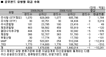 현금흐름으로 살펴보면, 한주간 국내 펀드는 1조 241억원의 자금이 빠져나갔다. 유형별로는 주가지수 하락에도 불구하고 주식형펀드(ETF 제외)로 1,784억원의 자금이 유입됐다. 반면, 채권형 펀드에서는 767억원이 빠져나갔고 MMF형에서도 1조 2,919억원의 대규모 자금유출이 발생했다.