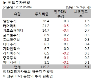 대회 참가자들의 펀드 투자현황에서는 커머디티와 기초소재섹터형 펀드가 각각 -0.5%p, -0.4%p의 큰 감소폭을 보였다. 뒤를 이어 러시아펀드가 -0.2%p 감소했고 중국주식 펀드와 에너지섹터 펀드가 각각 -0.1%p씩 하락했다. 이는 전주, 국내 및 해외 주식형 펀드의 호황으로 대회 참가자들의 주식형펀드 매수가 증가했고 최근 발생한 원자재가격 하락과 이로 인한 펀드의 환매가 원인이라고 판단된다.