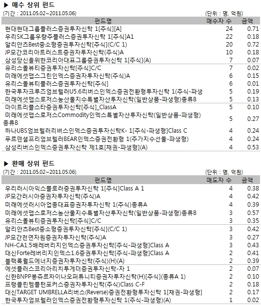 매수상위펀드는 전 주, 국내 주식시장의 호조로 인해 국내 주식형 펀드가 강세를 나타냈다. ‘현대현대그룹플러스증권투자신탁 1[주식][A]’이 24명의 매수자를 보였고 뒤를 이어 ‘우리SK그룹우량주플러스증권투자신탁 1[주식]A1’이 22명의 매수자를, ‘알리안츠Best중소형증권투자신탁[주식](C/C 1)’이 20명의 매수자를 보이며 상위펀드에 기록되었다.