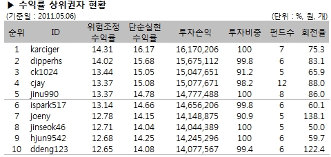 [2011/05/06 대회시황] 국내 및 글로벌 증시 불황으로 대회 수익률 하락