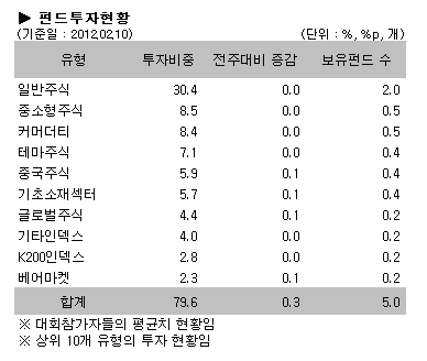 참가회원의 투자현황은 국내외 주식형펀드 상승에도 불구하고 전주대비 큰 변동은 없었으며 중국주식펀드, 기초소재섹터펀드, 글로벌주식펀드가 각각 0.1% 증가했다.