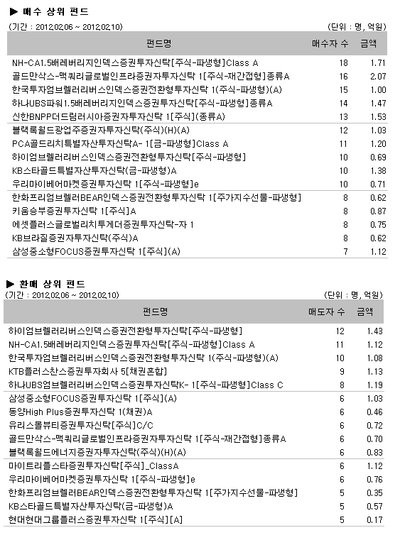 환매상위펀드는 리버스 펀드의 환매가 두드러졌다. ‘하이엄브렐러리버스인덱스증권전환형투자신탁[주식-파생형]’ 이 매도자 12명으로 환매 1위에 올랐고, 지난주에 이어 ‘NH-CA1.5배레버리지인덱스증권투자신탁[주식-파생형]Class A’ 역시 지속적인 환매를 보이고 있는 가운데 ‘ 한국투자엄브렐러리버스인덱스증권전환형투자신탁 1(주식-파생형)(A)’ 도 환매상위펀드에 이름을 올렸다.